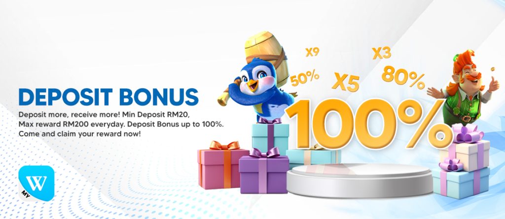 Deposit more, receive more! Min Deposit RM20, Max reward RM200 everyday. Deposit Bonus up to 100%. Come and claim your reward now!