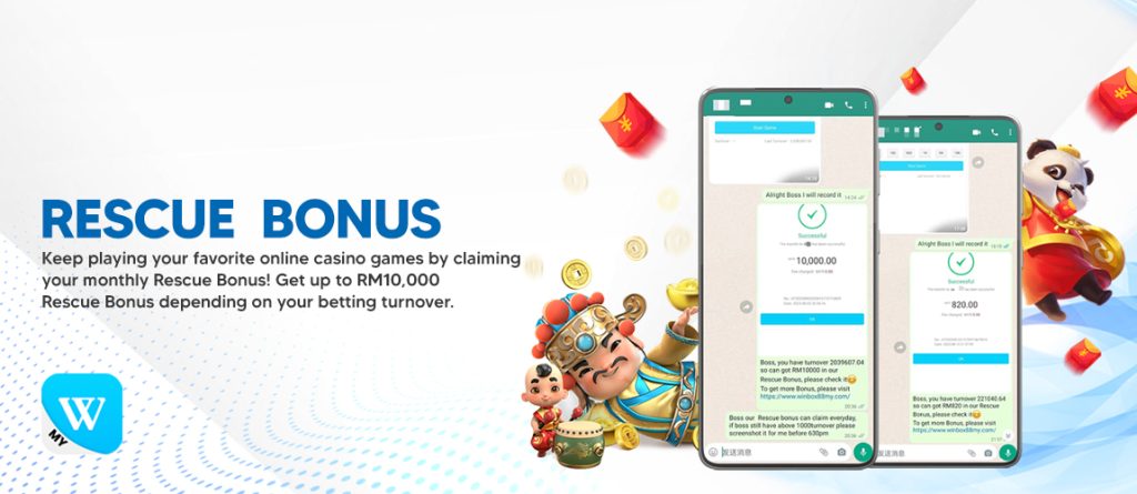 Keep playing your favourite online casino games by claiming your monthly Rescue Bonus! Get up to RM10,000 Rescue Bonus depending on your betting turnover.